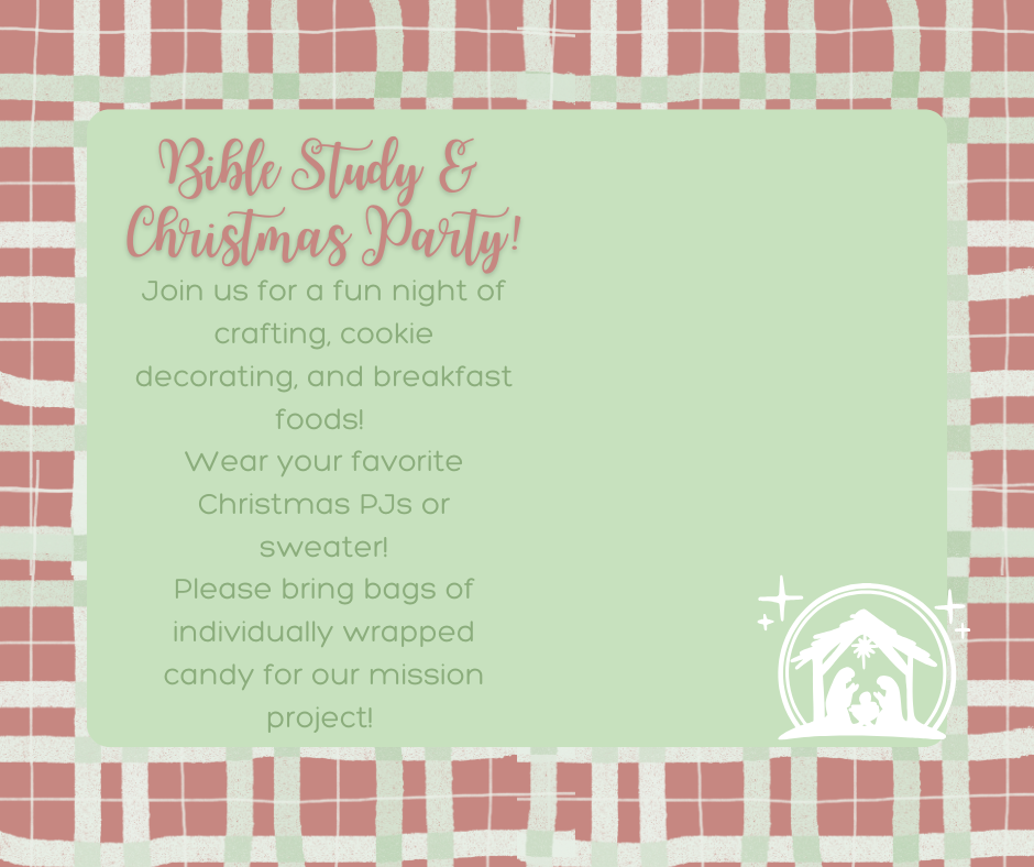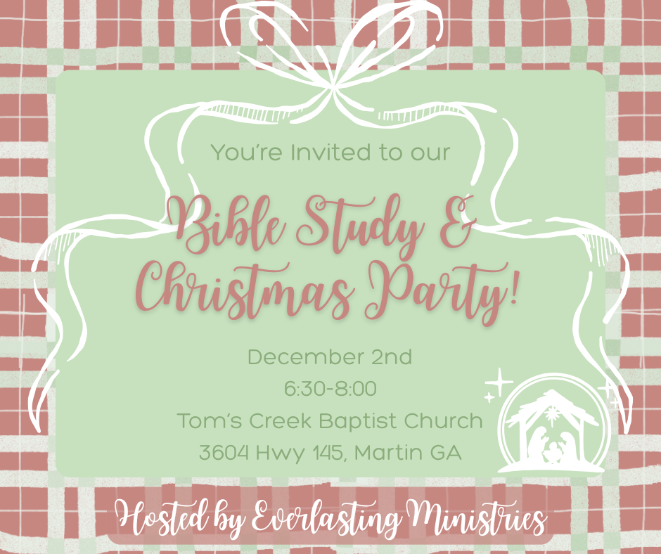 Join us for our next Bible Study and “Friendsgiving” on Tuesday, December 2, 2025, at Tom’s Creek Baptist Church located at (3604 Hwy 145 Martin, GA 30557) from 6:30- 8:00 PM