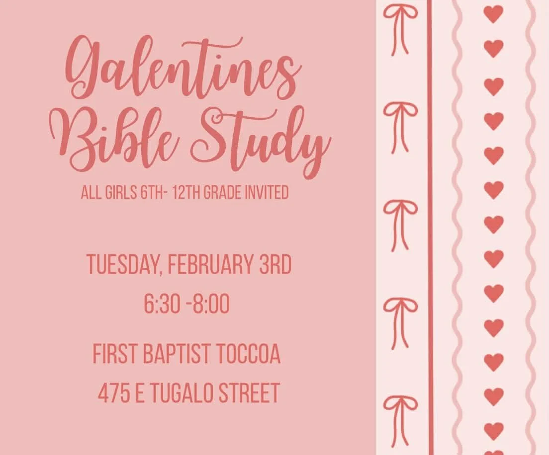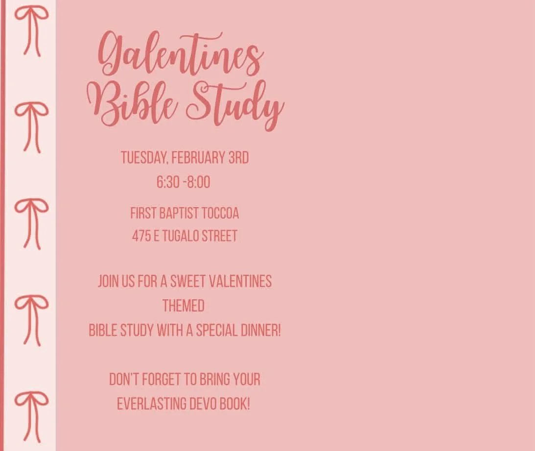 Join us for our next Bible Study on Tuesday, February 3, 2026, at First Baptist Church of Toccoa at (475 E Tugalo Street | Toccoa, GA 30577) from 6:30- 8:00 PM